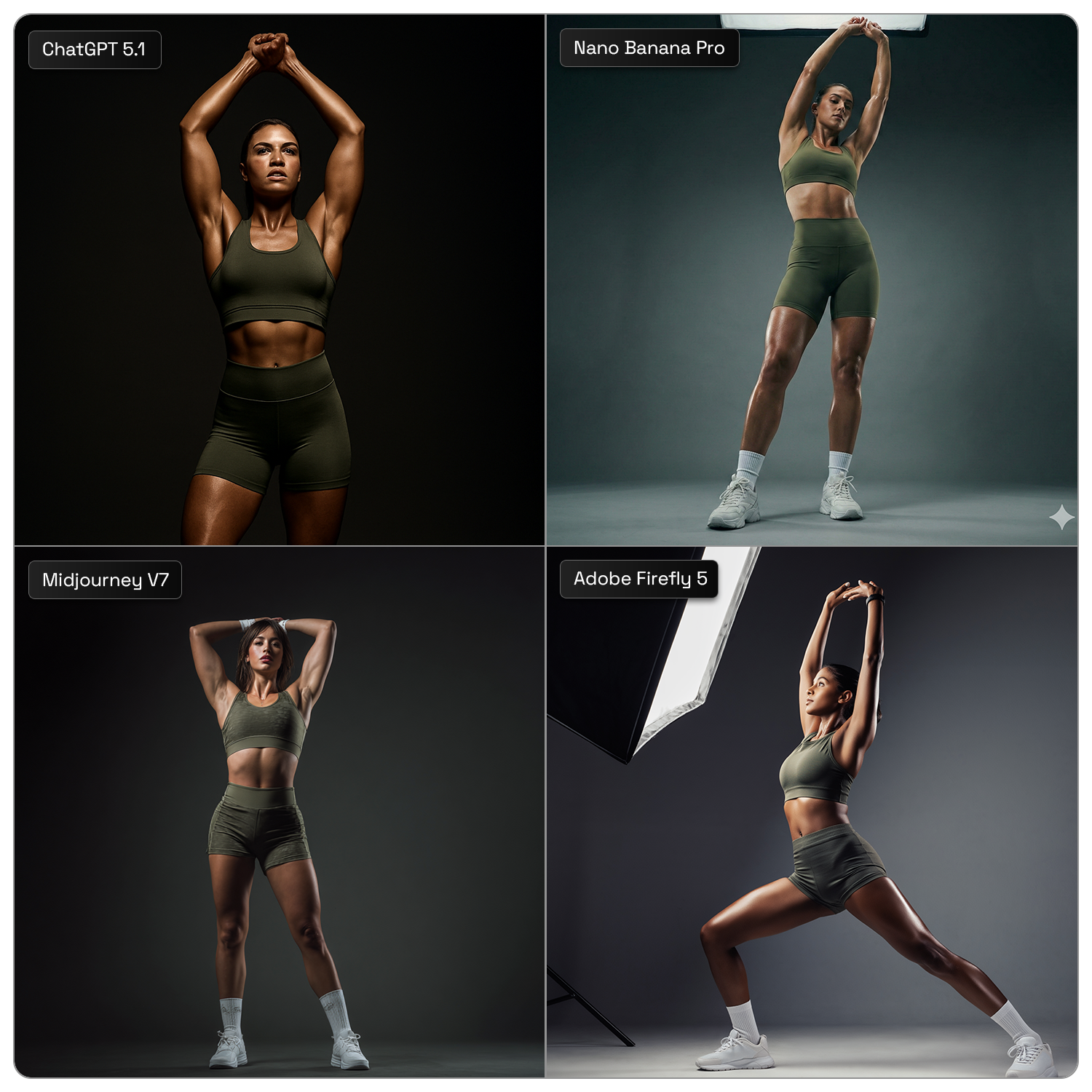 Prompt: “Full body studio photography of a fit female athlete stretching arms overhead, wearing a matching olive green ports bra and biker shorts set with white crew socks and white sneakers. Hyper-realistic skin texture with visible sheen and sweat. Dramatic moody lighting, chiaroscuro effect, single overhead softbox highlighting the shoulders and legs. Background is a seamless dark grey to dark gradient studio backdrop. Shot on 85mm lens, low angle, sharp focus, high contrast, cinematic color grading, commercial sportswear editorial style, 8k resolution. Aspect Ratio 1:1”