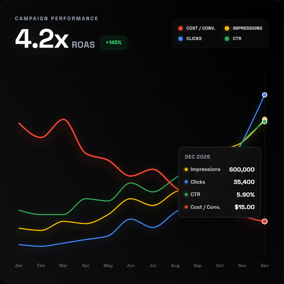 Throwing money at a "Boost Post" button or running basic Google Ads isn't a strategy; it's a liability. We build precision-targeted, data-driven advertising campaigns across Search, Social, and Display networks to capture high-intent buyers. By combining cutting-edge AI bid management with elite creative design, Scauros ensures every dollar you spend is engineered to generate a measurable return. We handle the targeting, the testing, and the scaling.